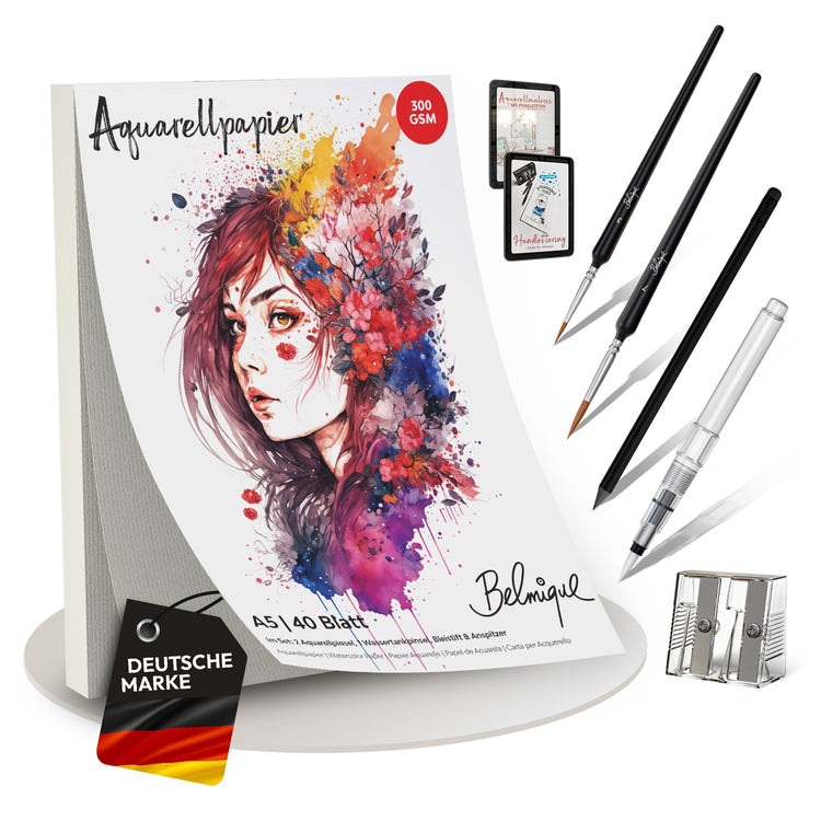 - Komplettes A5 Set mit Zubehör - Der Aquarellblock enthält 40 Seiten im A5 Format sowie einen Brushpen, zwei Pinsel in feiner und mittlerer Größe, einen Bleistift und einen Anspitzer für den direkten Start.