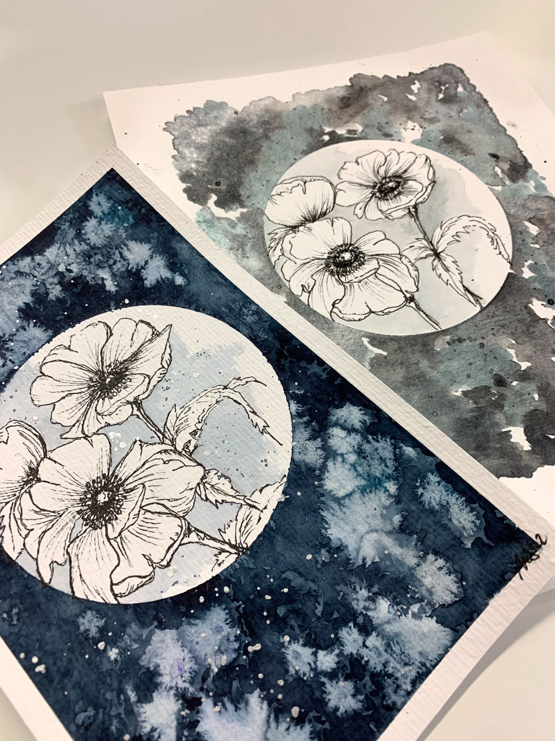 In diesem Kreativ Workshop zeige ich Dir Schritt für Schritt, wie Du in Kombination mit glitzerner Aquarellfarbe und dem Einsatz von einem wasserfesten Fineliner , dieses wunderschönen Muster als Hintergrund und die Anemonen vor einem Kreis oder auch Mond gestaltest. Die Skizze für die Blumen habe ich Dir bereits vorbereitet und Du kannst sie in Ruhe und in Deinem Tempo auf Dein Aquarellpapier übertragen. Wir gestalten gemeinsam einen besonderen Hintergrund und sparen dabei den Innenkreis bewusst aus. Sobald der Hintergrund getrocknet ist, kannst Du die florale Skizze mit dem Fineliner nachmalen und noch einen Aquarell Hintergrund der Blumen andeuten. Besonders schön macht sich auch ein Handlettering im unteren Bereich der Komposition. Deiner Kreativität sind keine Grenzen gesetzt. Du könntest einen Platz im Hintergrund dafür im Vorwege abkleben oder im Nachhinein gestalten, ausschneiden und mit 3D Aufklebern auf dem Bild befestigen.