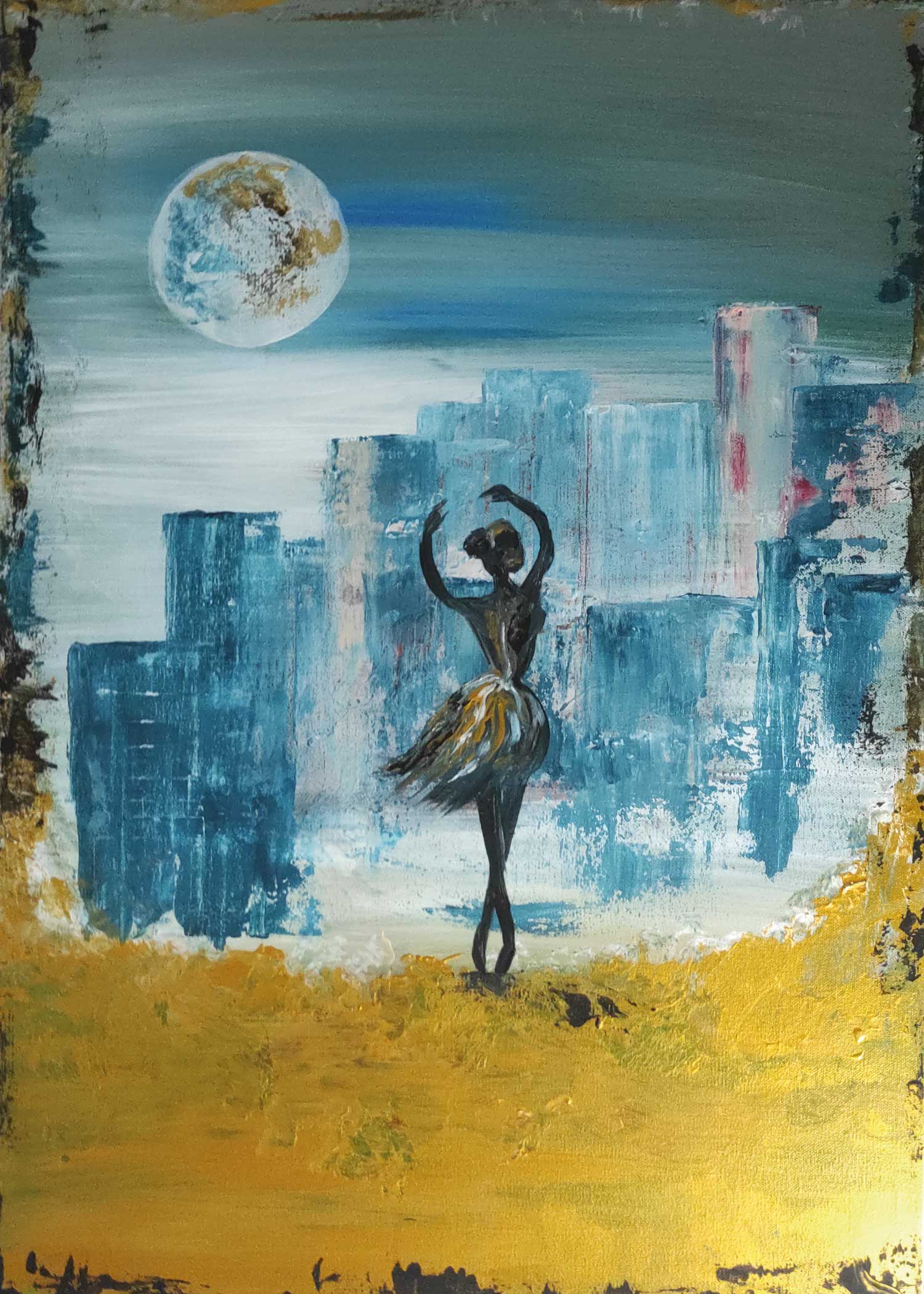 The painting is taken like a selfie, with a slight tilt towards the camera. The dancer stands out against the background, which consists of different shades of blue. Her body is curved and moves gracefully while her face is turned towards us, inviting us to admire her dance.
