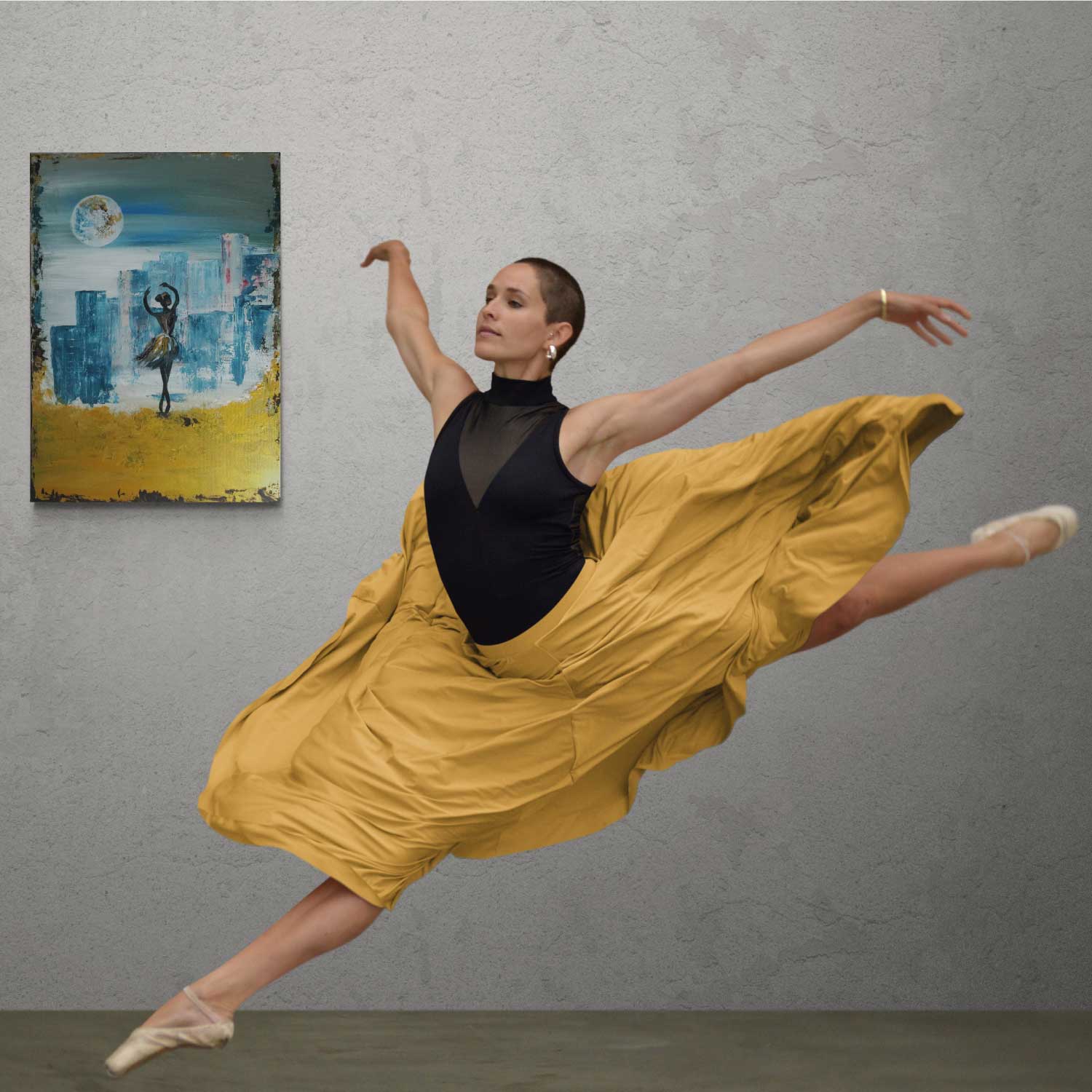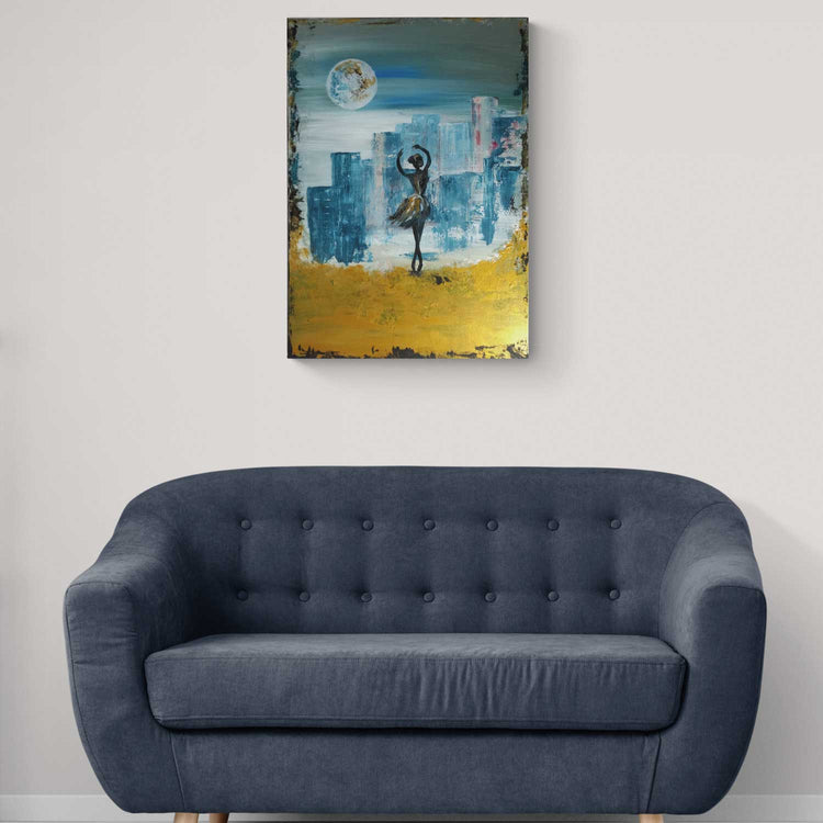 The dancer is easy to spot in the scene. Why not also in the work of art? It looks great in front of the city that is full of challenges and opportunities at the same time.