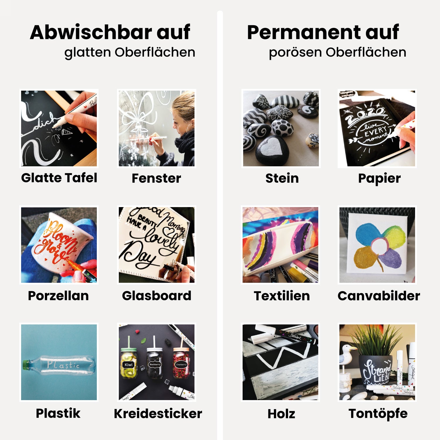 CHALK PENS FOR WINDOWS AND MORE - Brilliant white colors on a variety of smooth surfaces! Whether window, whiteboard, blackboard or glass - our markers can be used as whiteboard markers, glass markers, chalk paint & window pens and express bold colors!