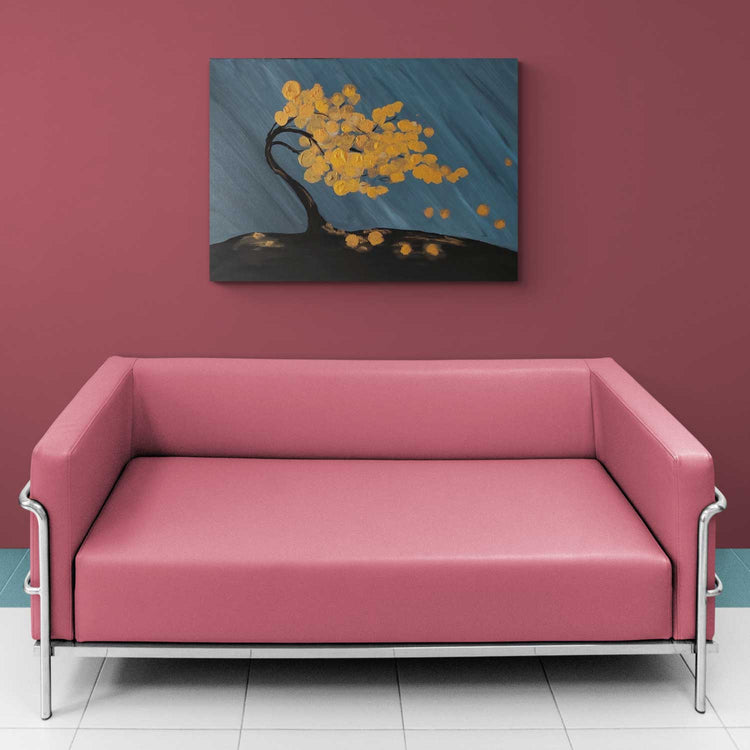 This artwork depicts a mysterious golden tree using beautiful golden paint with a special technique. Depending on the changing brightness in your room, you can observe different shades of gold.