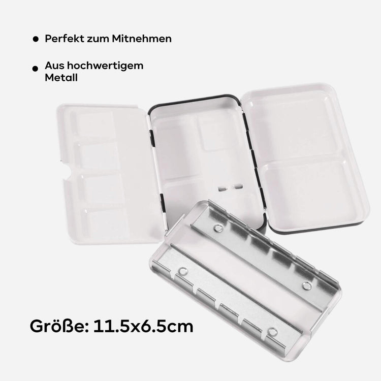Geeignet für halbe und ganze Aquarellnäpfchen - Unsere Aquarellfarbkästen sind speziell für halbe und ganze Aquarellnäpfchen konzipiert. Sie sind so gestaltet, dass Du Deine Farben sicher und organisiert aufbewahren und transportieren kannst.
