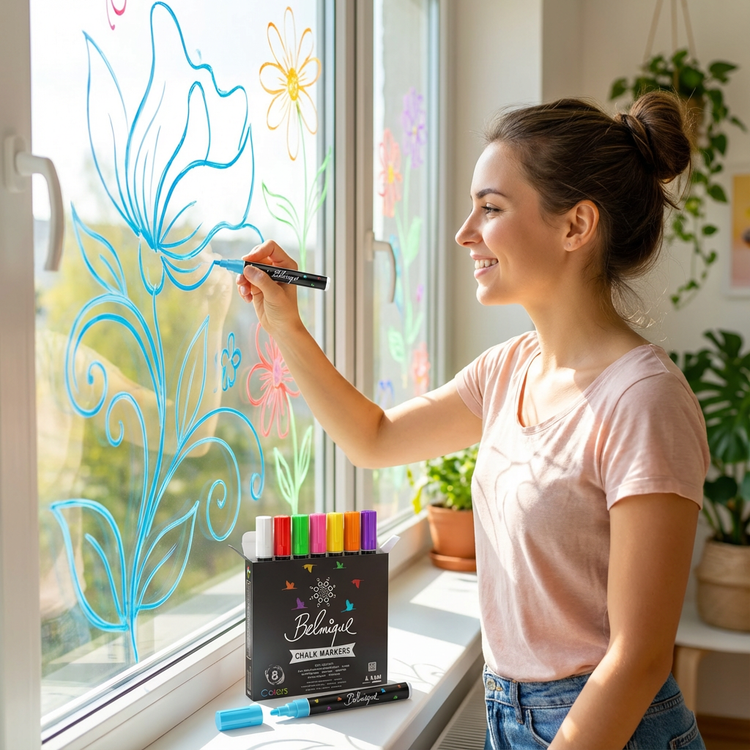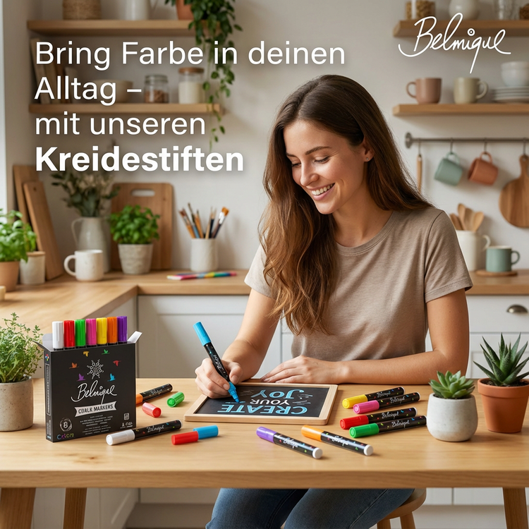 Mit unseren Kreidemarkern kannst du deiner Fantasie auf jeder Oberfläche Ausdruck verleihen. Ob Glas, Tafel oder Fenster – unsere vielseitigen Marker bieten dir kräftige Farben und sind leicht abwischbar. Entdecke die kreativen Möglichkeiten mit Belmique!"