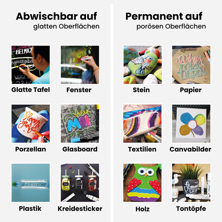 FLEXIBLE USABLE MARKERS - Bright pastel colors on a variety of smooth surfaces! Whether window, whiteboard, chalk board or glass - our markers can be used as whiteboard markers, glass markers, chalk pens & window pens and express strong colors!