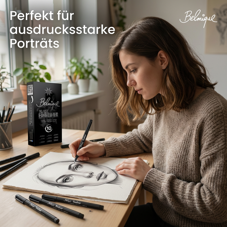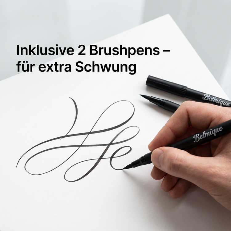 The Belmique Fineliner and Brush Pen Set consists of 8 fineliners and 2 brush pens. The colors of the fineliners are black. However, each individual pen is particularly colour-intensive, so that your lettering and drawings get a special radiance.