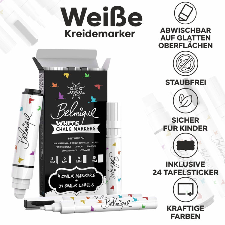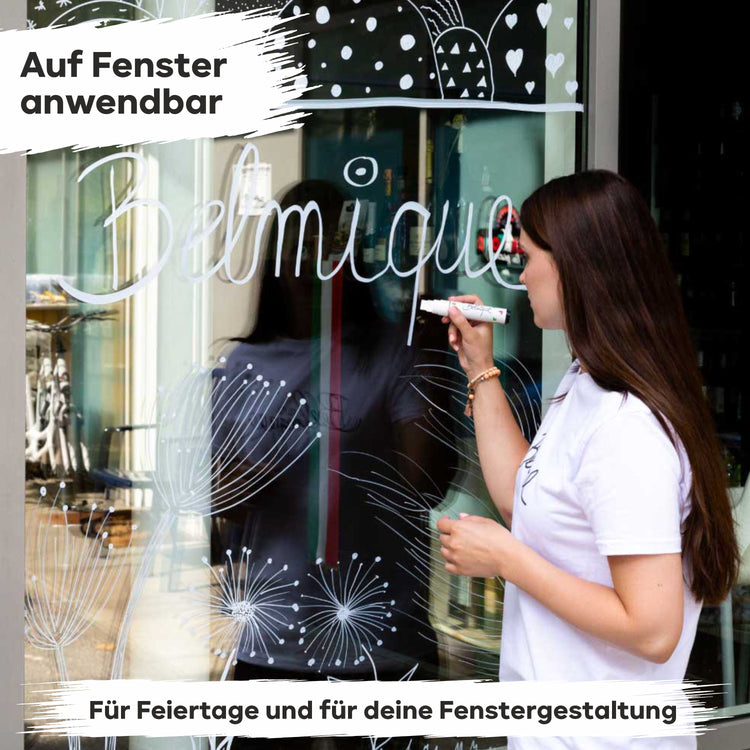 NUMEROUS SURFACES - Brilliant, opaque white chalk paints on a variety of smooth surfaces! Whether window, whiteboard, blackboard or glass - the Belmique window crayons can be used as marker pens, glass markers, chalk paint & window pens and express strong colors!